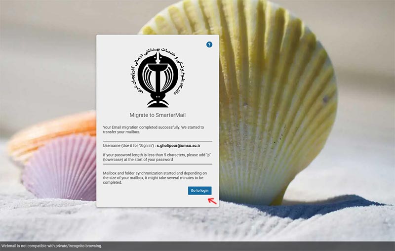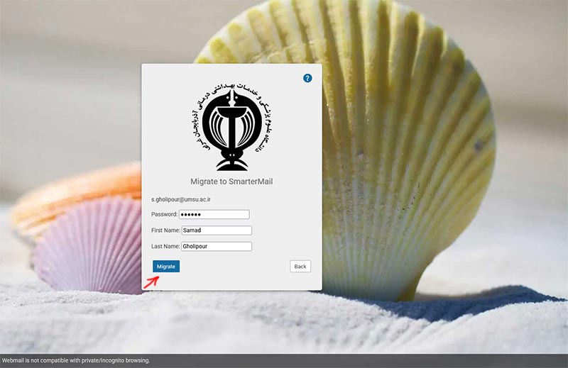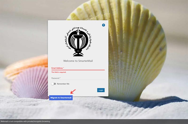 در صفحه ورود به سایت بر روی گزینه Migrate to SmarterMail کلیک نمایید. (توجه! این عملیات فقط یک بار بر روی ایمیل شما انجام می شود و پس از انتقال اطلاعات نیازی به انجام این مراحل نیست)