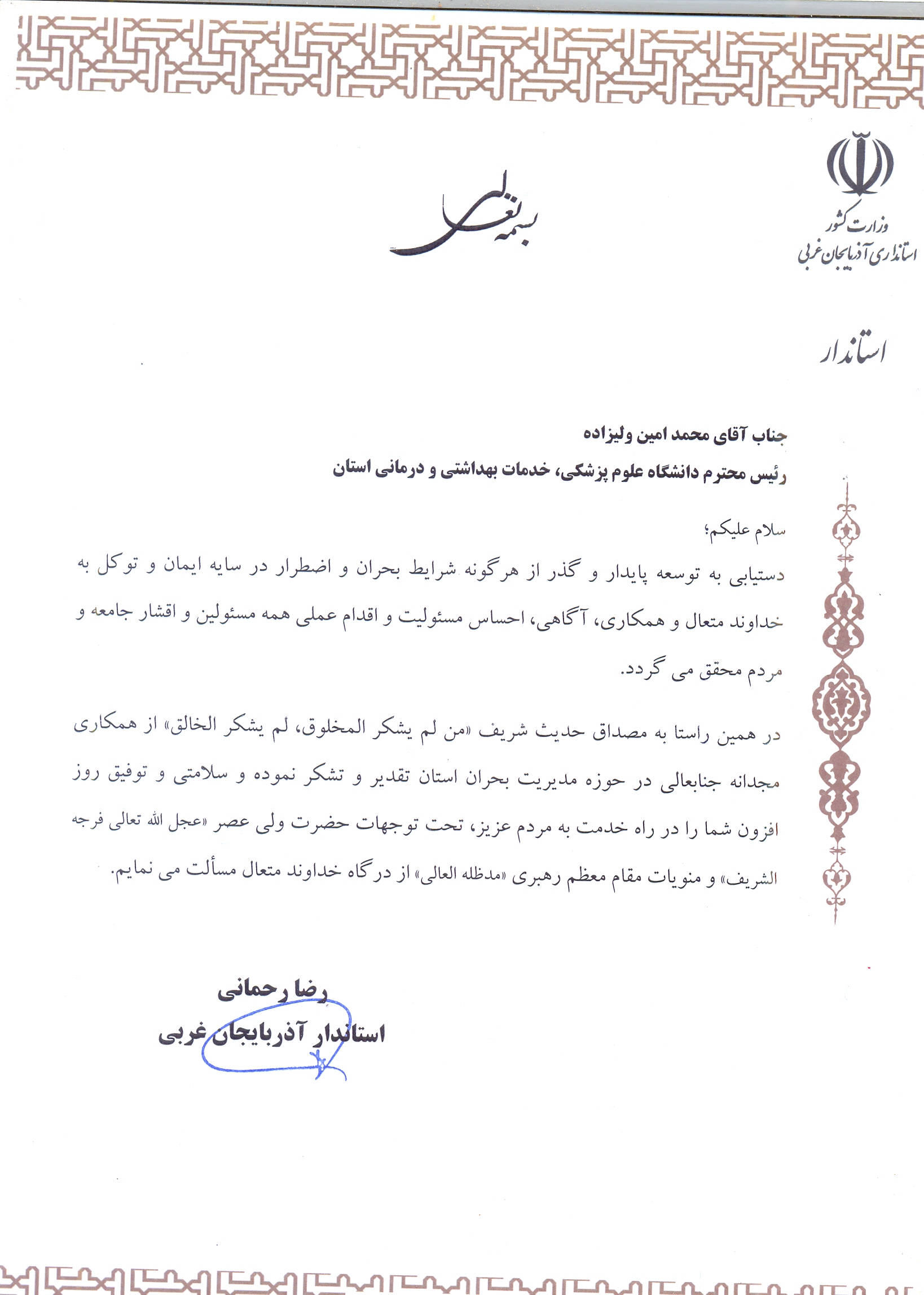 تقدیر استاندار آذربایجان غربی از رئیس دانشگاه علوم پزشکی استان