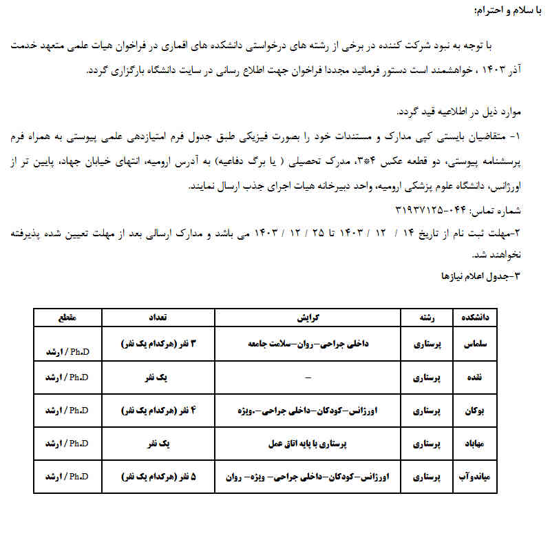 متقاضیان بایستی مدارک شاملcv و فرم پرسشنامه تکمیل شده (پیوستی) به همراه مدارک مندرج در پرسشنامه را به صورت فیزیکی به آدرس ارومیه انتهای خیابان جهاد پایین تر از اورژانس دانشگاه علوم پزشکی ارومیه واحد دبیرخانه هیات اجرائی جذب (شماره تماس: 04431937125) ارسال نمایند.