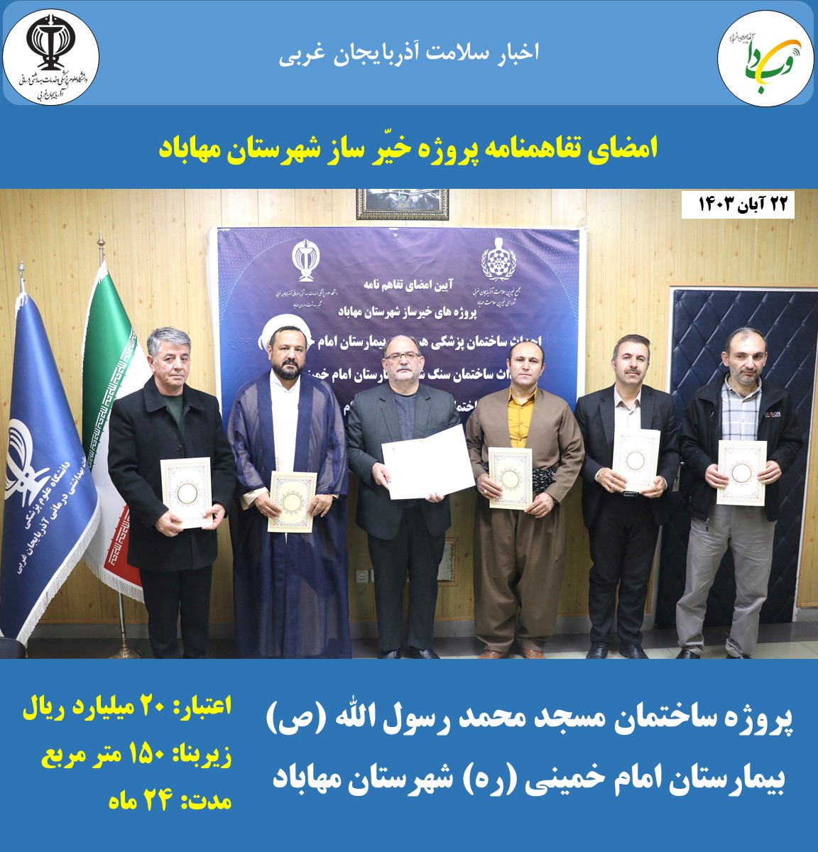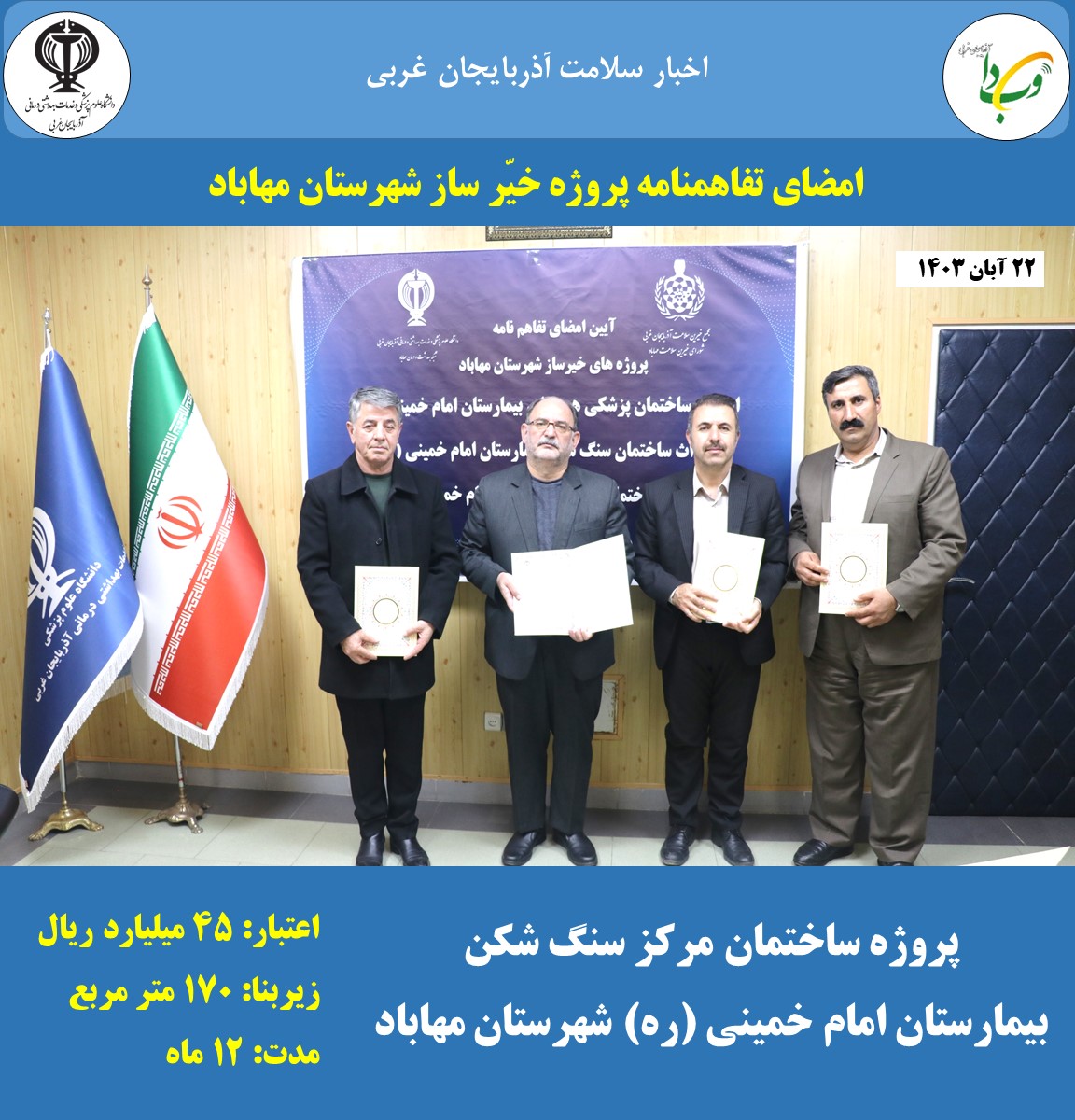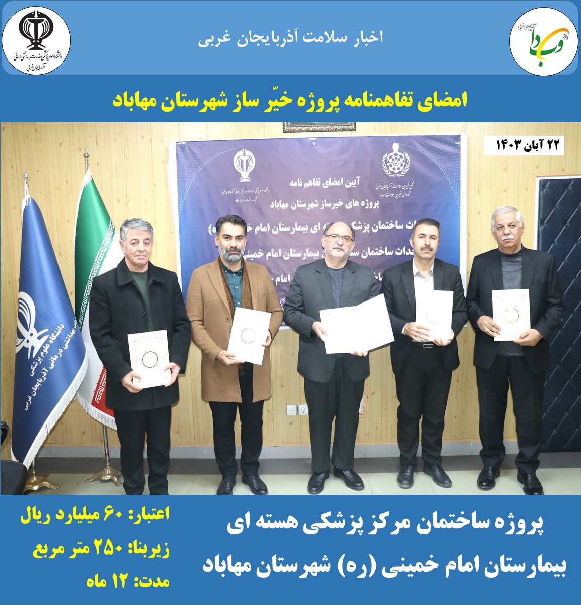 با حضور دکتر ولی زاد رئیس دانشگاه علو پزشکی و خدمات بهداشتی درمانی استان آذربایجان غربی، حجت الاسلام طاهری رئیس نهاد نمایندگی ولی فقیه در دانشگاه علوم پزشکی ارومیه، شاکری نایب رئیس مجمع خیرین سلامت استان، مهندس عبدالخالق حسن زاده رئیس شورای خیرین سلامت شهرستان مهاباد، دکتر امیری مدیر شبکه بهداشت و درمان مهاباد، حاج عبداله حسن زاده خیر ساختمان مرکز پزشکی هسته ای، آوات عزیزی خیر ساختمان مرکز سنگ شکن، آسو معروفی و ایوب اسماعیل نسب خیر ساختمان مسجد محمد رسول الله(ص) مراسم امضای تفاهم نامه پروژه های فوق در تاریخ 22 آبان 1403 در محل دفتر ریاست دانشگاه علوم پزشکی و خدمات بهداشتی درمانی ارومیه برگزار شد.